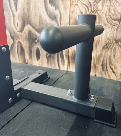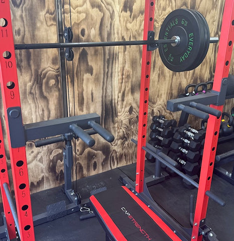 This system comes with safety spotter catches, land mine attachments (awesome) and easy to adjust dip attachments.